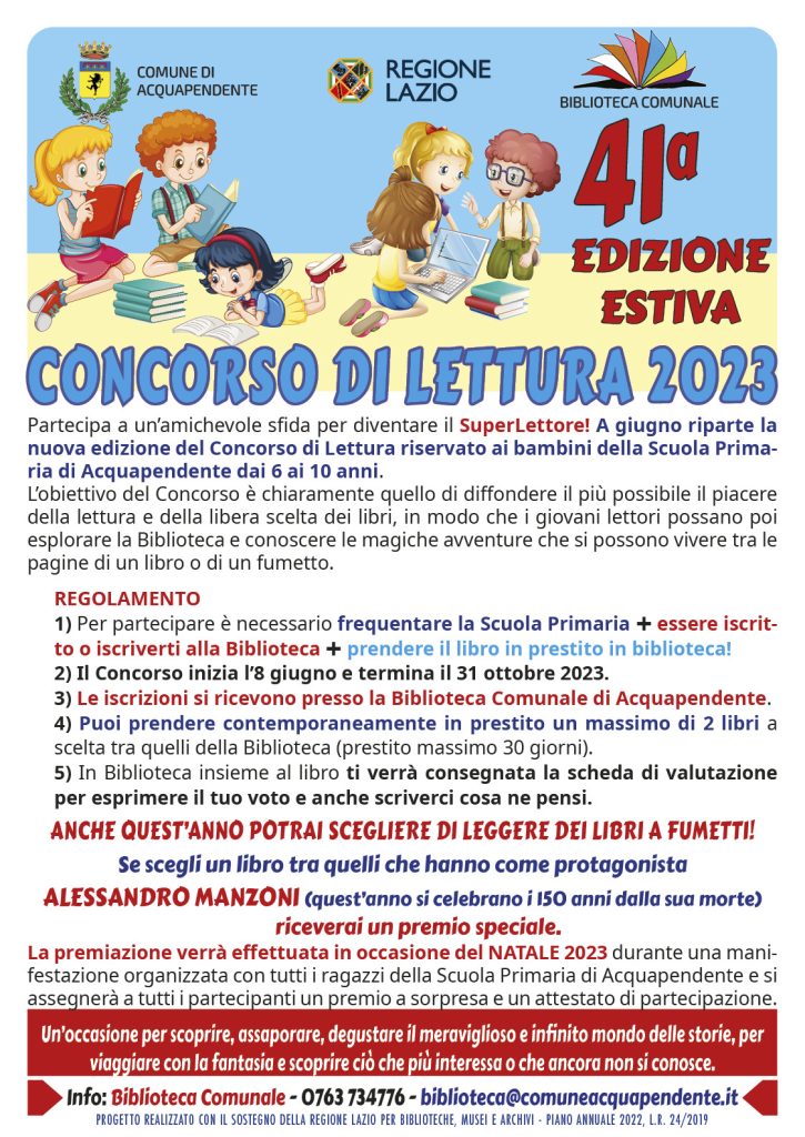 Inizia la 41°edizione del Concorso di Lettura Estiva 2023 della Biblioteca Comunale di Acquapendente, riservato ai bambini della Scuola Primaria (6-10 anni). Dal 8 giugno… Leggi tutto: Concorso di lettura 2023! 41°edizione estiva - VALENTANO – “Omaggio a Italo Calvino”, a 100 anni dalla nascita, di e con Gianni Abbate