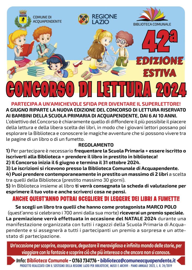 Inizia la 43° edizione del Concorso di Lettura 2025 della Biblioteca Comunale di Acquapendente, dedicato ai bambini della Scuola Primaria. Dal 9 giugno al 31… Leggi tutto: Concorso di lettura! 43° edizione estiva - BOLSENA – DOPPIA PRESENTAZIONE DI LIBRI E LABORATORIO DI DISEGNO con l’autrice Roberta Mezzabarba