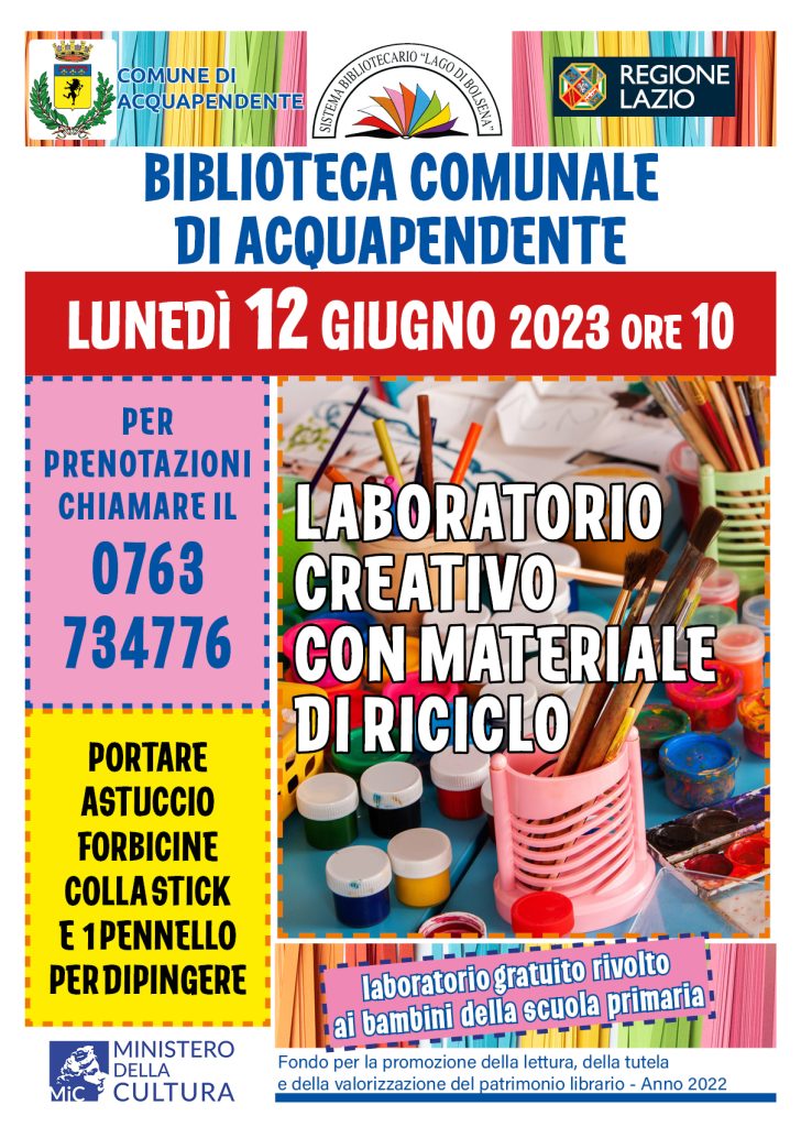 Lunedì 12 giugno 2023 alle ore 10, presso la Biblioteca Comunale di Acquapendente, si terrà un laboratorio gratuito per bambini della scuola primaria. Con materiale di riciclo,… Leggi tutto: Laboratorio creativo per bambini: riciclo e fantasia alla Biblioteca di Acquapendente. - Concorso di lettura 2023! 41°edizione estiva
