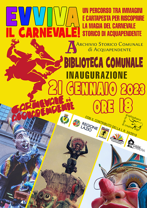 Sabato 21 gennaio 2023, alle ore 18, l’Archivio Storico Comunale di Acquapendente inaugura una mostra dedicata alla magia del Carnevale Storico locale. Un viaggio tra immagini e… Leggi tutto: Evviva il Carnevale! Mostra storica tra immagini e cartapesta ad Acquapendente - BOLSENA- Aspettando la Befana…letture e laboratori per bambini